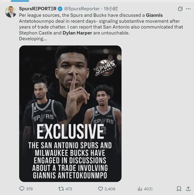 据NBA名记Jake Fischer报道,尽管很多球迷把马刺当成字母哥的热门下家,但消息人士透露,马刺不愿意为了字母哥放弃队中的年轻后卫:斯蒂芬-卡斯尔和迪伦-哈珀。马刺态度很明确,可以搭上几个首轮签,不过这俩人是非卖品。